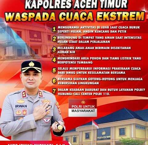 Kapolres Aceh Timur Melalui imbauan Kamtibmas, masyarakat diingatkan untuk; Pertama: Mengurangi aktivitas di luar rumah saat cuaca buruk seperti hujan lebat, angin kencang, dan petir; Kedua, Berlindung di tempat yang aman saat intinsitas hujan lebat dalam perjalanan; Ketiga, Melarang anak-anak bermain di sekitar aliran air; Keempat, Menghindari area pohon dan tiang listrik yang berpotensi tumbang; Kelima, Selalu memperbarui informasi prakiraan cuaca dari BMKG untuk keselamatan bersama; dan Keenam, Bersama giatkan gotong royong untuk menjaga kebersihan lingkungan.