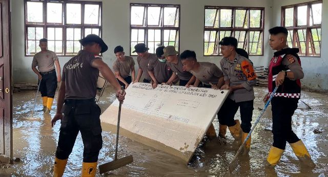 “Hari ini personel gabungan Polri bersinergi membersihkan sisa-sisa material sampah dan lumpur yang mengendap di area vital, khususnya di halaman kantor dan ruang aula Kecamatan Simpang Ulim,” ujar AKBP Irwan Kurniadi.