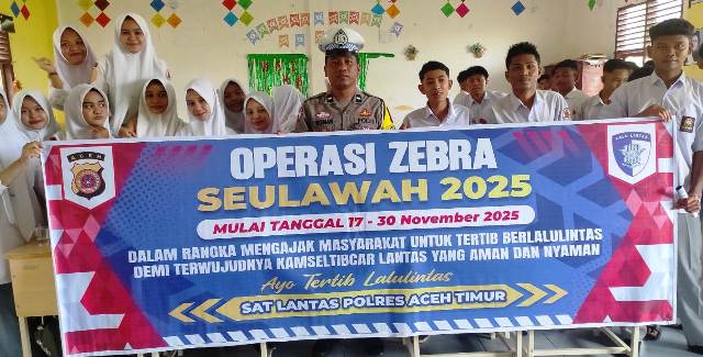 ACEH TIMUR – Polres Aceh Timur, Polda Aceh memberikan edukasi kepada pelajar SMAN 1 Peureulak tentang keselamatan berlalu lintas sebagai bagian dari rangkaian kegiatan Operasi Zebra Seulawah Tahun 2025.