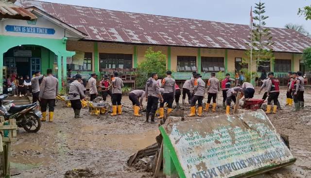 ACEH TIMUR – Sebagai bentuk kepedulian terhadap dunia pendidikan pascabencana hidrometeorologi , Polres Aceh Timur bersama personel BKO Brimob dri Resimen I Kedung Halang, Bogor melaksanakan gotong royong dengan membersihkan MIN 15 Aceh Timur di Gampong Buket Bata, Kecamatan Pante Bidari yang terdampak banjir beberapa waktu lalu.
