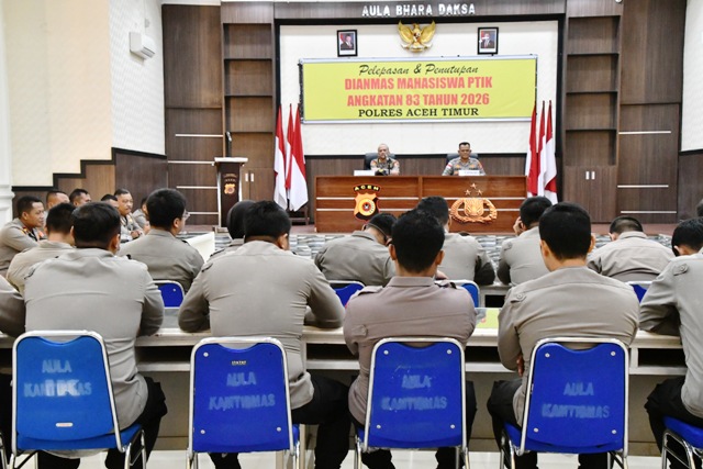 ACEH TIMUR – Kegiatan pengabdian masyarakat mahasiswa STIK Lemdiklat Polri Angkatan 83 WPS Sindikat II Tahun 2026 di wilayah hukum Polres Aceh Timur resmi ditutup, Jumat (27/2/2026). Acara pelepasan dan penutupan berlangsung di Aula Bhara Daksa dipimpin oleh Kapolres Aceh Timur AKBP Irwan Kurniadi, S.I.K. yang diwakili oleh Wakapolres Kompol Abdul Muin, S.H.,M.M.